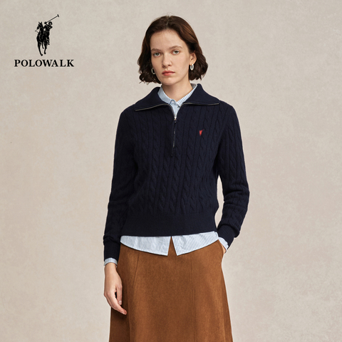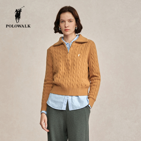 【100%绵羊毛】POLOWALK女式羊毛衫2025冬季新品翻领绞花套头上衣