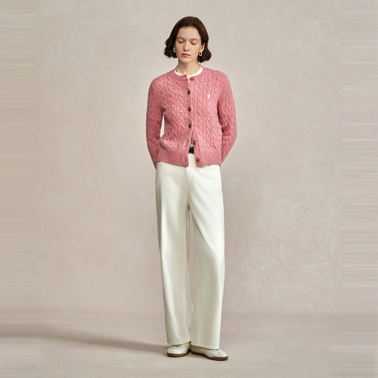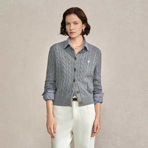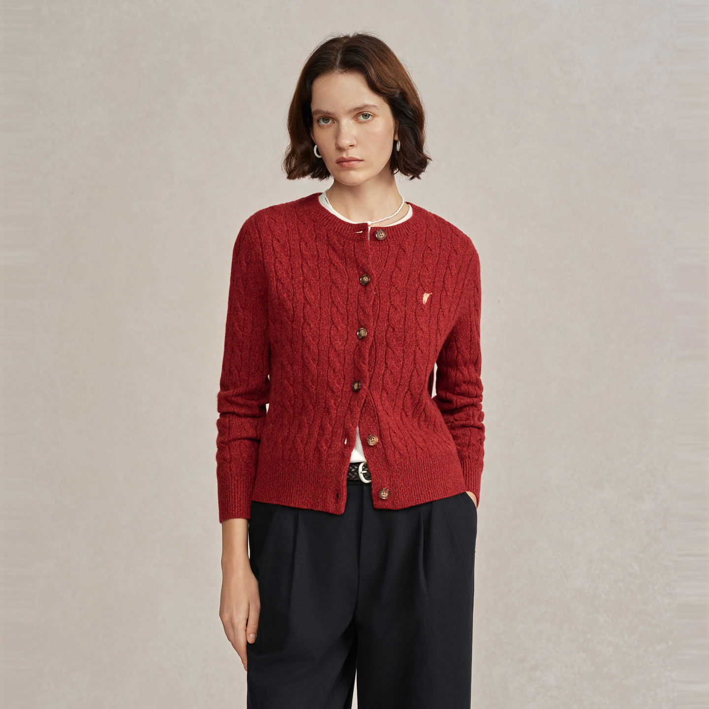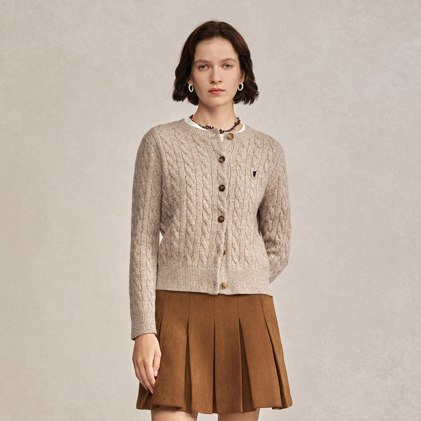【100%绵羊毛】POLOWALK羊毛针织开衫女秋冬款圆领绞花针织衫毛衣