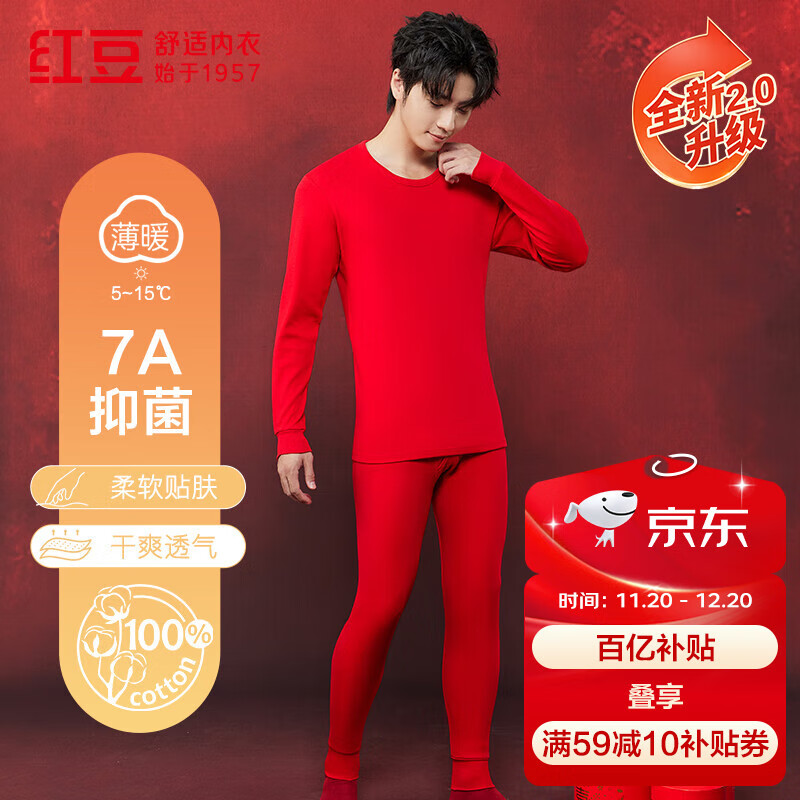 红豆内衣男7A抑菌升级秋衣秋裤纯棉套装圆领薄款打底保暖内衣