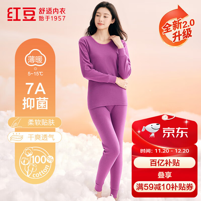 红豆内衣女7A抑菌升级秋衣秋裤纯棉套装圆领薄款打底保暖内衣