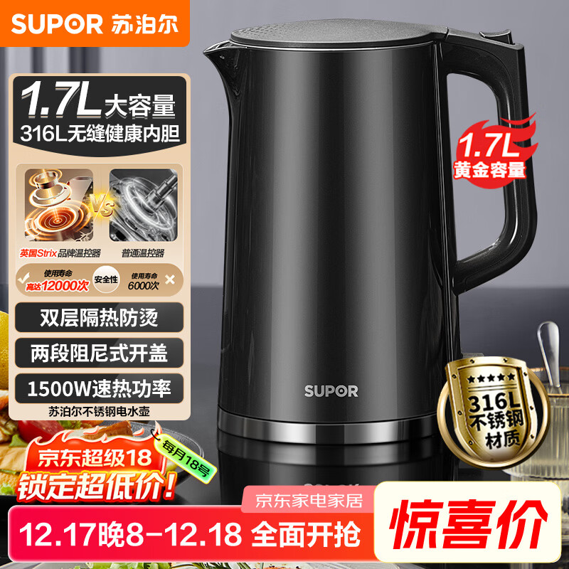 苏泊尔(SUPOR)电水壶热水壶 1.7L大容量全钢无缝内胆 双层防烫电热水壶 316L不锈钢烧水壶 SW-17J416L