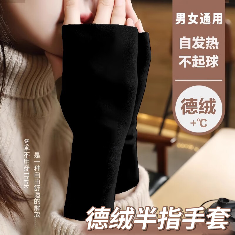 朋意保暖德绒半指手套女秋冬季保暖防寒学生写字办公打字漏指手套 德绒半指手套【黑色】1双 均码