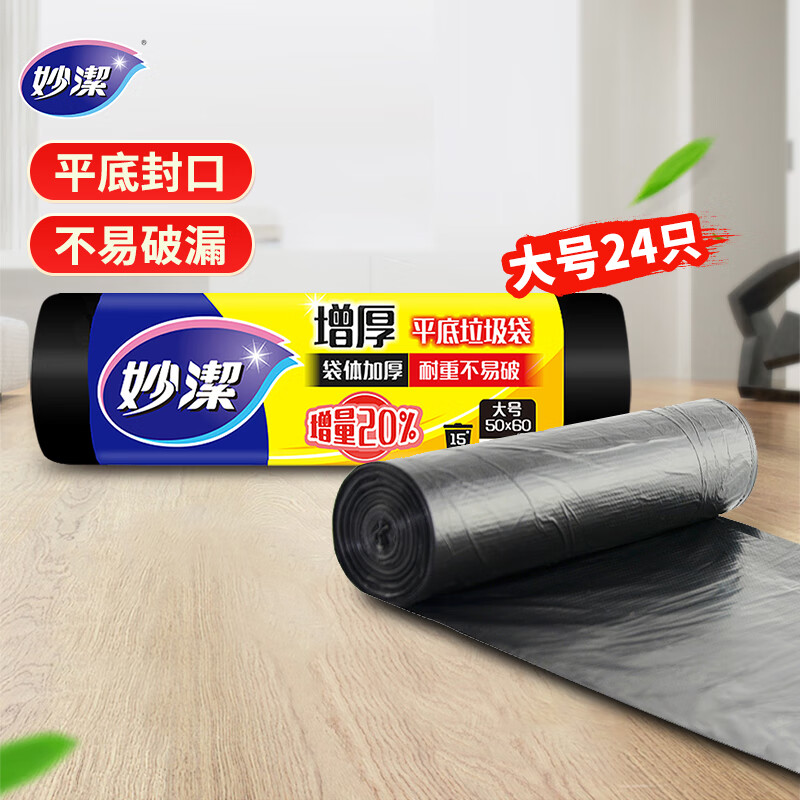 妙洁平口垃圾袋黑色50*60cm24只单面1.0丝点断式大号厨房用