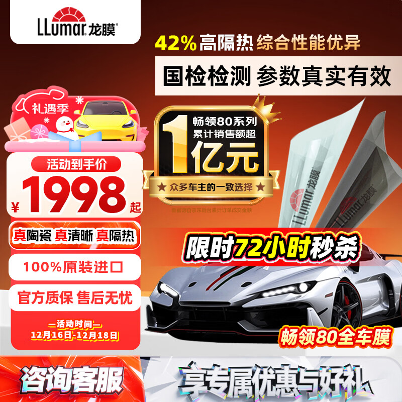 龙膜(Llumar)汽车贴膜新能源汽车玻璃膜全车膜太阳膜隔热膜车窗膜汽车贴膜防晒防爆膜包施工国际品牌 畅领80+15深色 轿车SUV通用