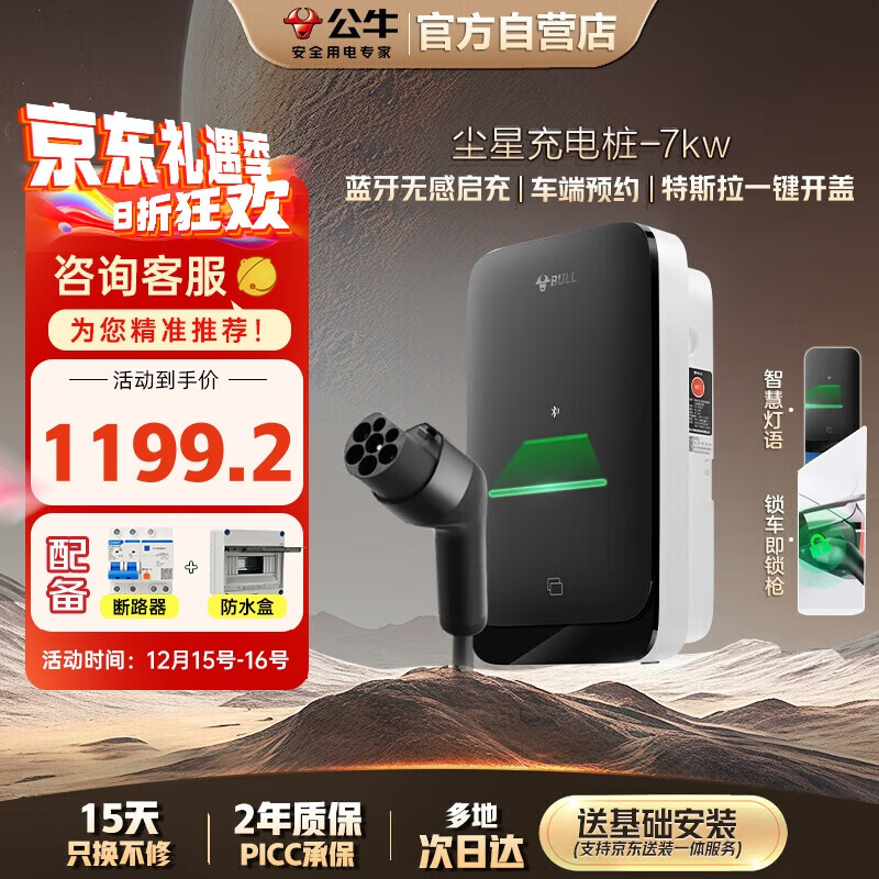 公牛充电桩家用新能源汽车交流适配于小米su7/yu7汽车特斯拉比亚迪问界蔚来 7KW尘星款 基础送装一体