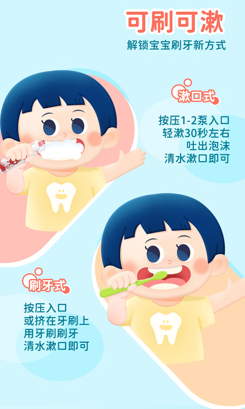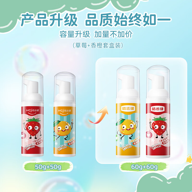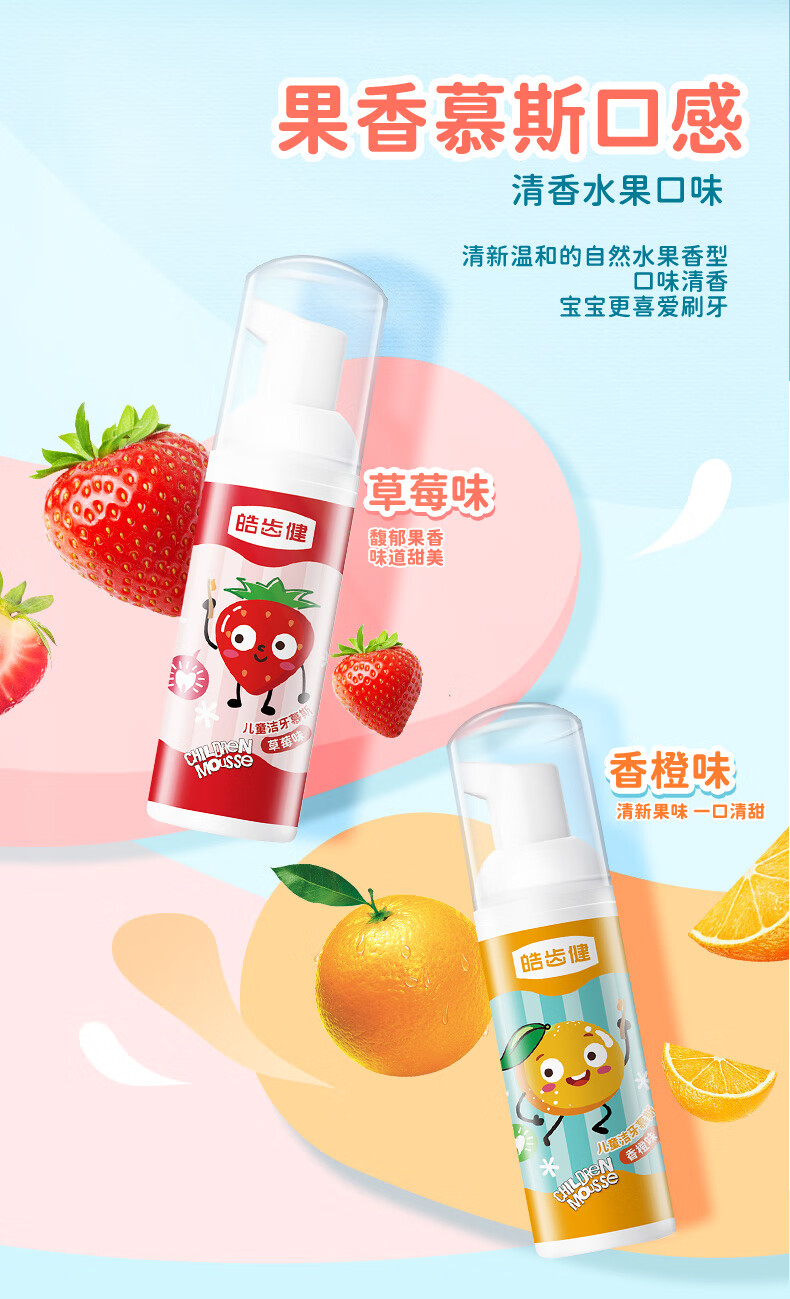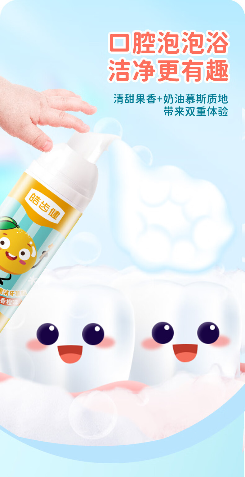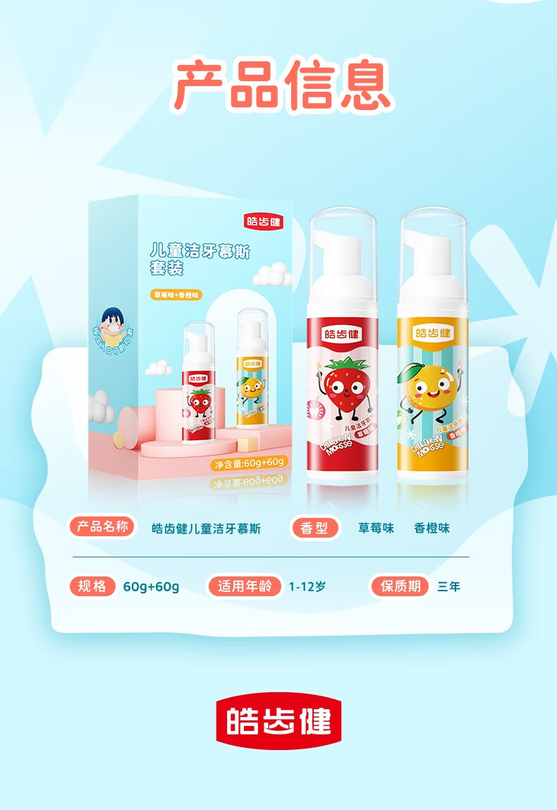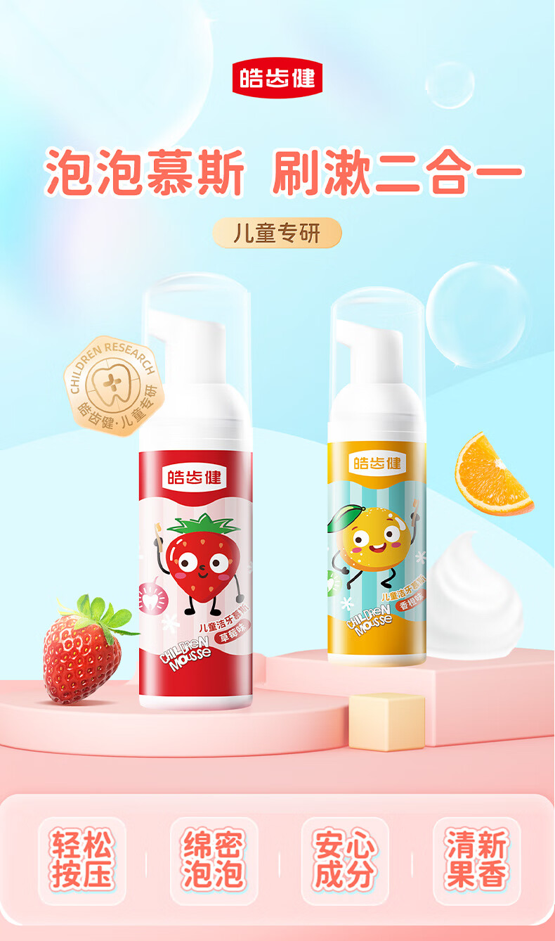 皓齿健1-12岁儿童宝宝益生菌可刷可漱洁牙慕斯泡泡套装草莓香橙味共120g
