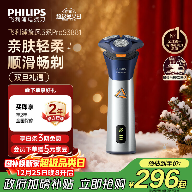 飞利浦(PHILIPS)电动剃须刀旋风3系PRO刮胡刀 风驰切剃6D浮动刀头 圣诞节礼物送老公送男友 父亲生日礼物 国家补贴